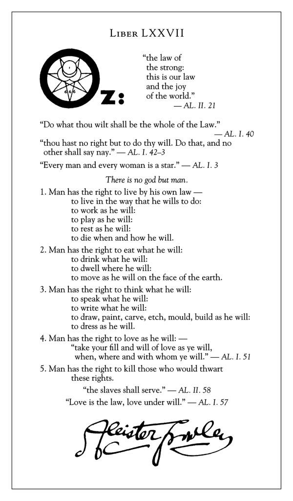 Personally, not all of this agrees with my interpretation of Thelema. I do not believe that right and wrong can be delineated aside from the notion of true will—whether one is to pursue one’s own or allow others to pursue theirs’, one the one hand, or restrict that freedom, on the other. I do not believe that it is always more blessed to give than to receive, at there are certainly those who don’t deserve a dime (or anything else) from me. The other tenets I either agree, disagree, or half-agree with.